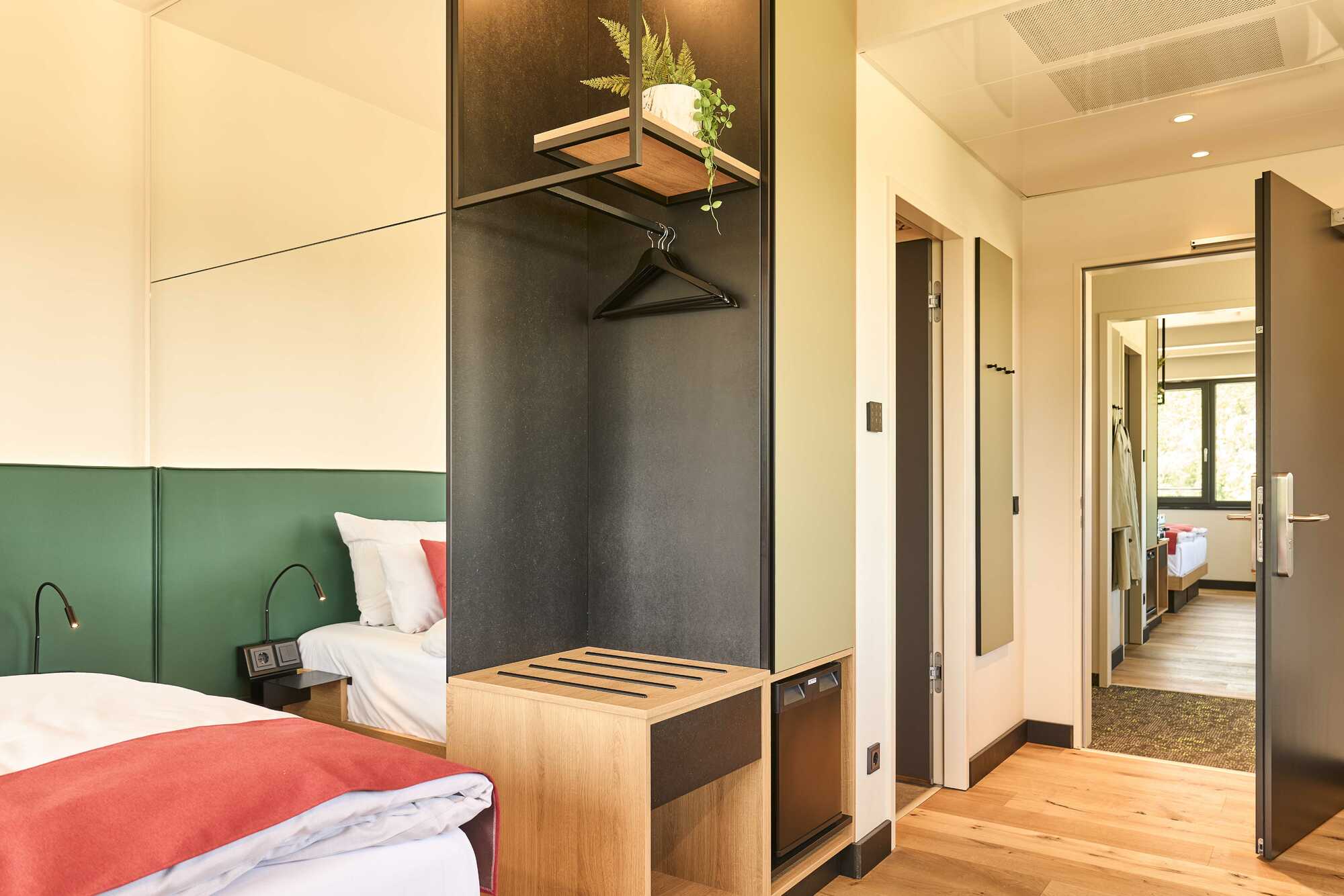 Eine Nespresso-Maschine steht für den ersten Kaffee bereit, die Minibar für kleine Erfrischungen zwischendurch. Natürliche Materialien und warmes Design verleihen den Räumen eine einladende, harmonische Atmosphäre.